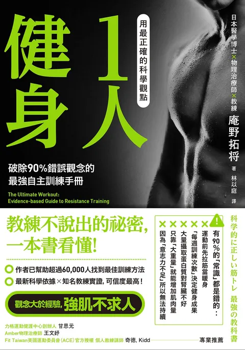 强肌不求人!打造线条/推迟老化/运动表现/强化肌力/养命长寿/最强蛋白质摄取掌握科学新方法,将每分每秒发挥到极致7个新常识.10个肌力公式.12个正确饮食观念.6个维持训练的攻略──教练不说出的秘密,一本书看懂!──【有90%的「常识」都是错的!】✕ 运动前先拉筋当暖身✕ 「每周训练次数」决定健身成果✕ 大量摄取蛋白质对肾脏不好✕ 只靠「大重量」就能增加肌肉量✕ 因为「意志力不足」所以无法持续★最高证据等级 ╳ 全球教练实证,可信度最高★作者已帮助超过60,000人找到最佳训练方法►为何非要「最正确的科学观点」?如果参考他人的经验法则,那10个教练就会有10种说法,而我们必须从庞大的信息中辨别真相。本书收集世界上「证据等级最高」的最新信息,每一项都来自最全面的研究,破除所谓的「常识」,包括许多无效,或甚至伤害身体的训练方式,不让你的努力白费。►「肌肥大」与「肌力增强」的不同训练模式目的不同,训练方式也会不同。我们必须先确立自己做肌力训练的目的,并理解最正确的知识。本书将健身分为两类,并根据最新研究,分别给出最棒的建议与菜单,包括「强度」,「组间休息时间」,「关节活动范围」,「运动速度」,「一周训练频率」等等。►蛋白质摄取全指南,市面上第1本!蛋白质是合成肌肉必备要素,是帮助你取得成果的重要盟友,但市售「高蛋白」至少超过5类,该如何选择,又如何避免伤身?本书归纳多项超过数十年的研究,介绍含有9种「必须胺基酸」的「优良蛋白质」,以图表清楚呈现最佳的摄取量与方式,欲提升成效,有些优质食物千万不能错过。►30分钟看懂《肌力训练圣经:基础杠铃教程》深蹲,硬举,卧推又称为「三大肌力训练方式」,也是训练者一定会接触的动作。本书详解最具代表性的必读经典:马克.锐普托的《肌力训练圣经》,将数万字内容再精炼浓缩,搭配最详尽的蛋白质摄取法,让你踏入正确自主训练的大门,改善运动表现,外型与生活质量。►五花八门的「增补剂」该如何选择?精胺酸,咖啡因,胺基酸,肌酸……市面上许多爆红的增补剂,其中有些在科学验证下却没有太大作用。本书罗列出可靠的补给品列表,细说功能与食用方式,并列出低证据等级的增补剂,让你在眼花撩乱的各式效果中找到正确的路。►「提升意志力」也有科学方法!人类本来就不适合肌力训练──在进化过程中,「懒」是帮助人类存活的天性。你不能让它消失,但你能用科学方法「管理」自己。心理学与脑神经科学近年来对此积极研究,并提出许多有建设性的方法如「若则计划法」,能帮助训练者实践计划。据统计,持续健身1年的人不到4%。但最新科学证实,只要用对方法就能大幅提升意志力──你准备好成为那4%了吗?【各界专业推荐】力格运动健护中心创办人/甘思元Amber物理治疗师/王文妤Fit Taiwan美国运动委员会(ACE)官方授权 个人教练讲师/奇德, Kidd「看过这本书,胜过听数个健身房巨巨的自身经验,我才试读不到一半就深深爱上它了。本书跟我的出发点相同,都是致力于推广大部分人无法触及的运动科学知识,科学像是一支火炬,照耀着你将要走的每一步,如果没有运动科学,就像在深邃的黑洞中行走,只能摸索前人的足迹,跌跌撞撞地向前行。我们藉由当前最新的研究,不停地往未知领域插上新的火炬,照亮并指引后人,得以找到不同的目标,运动适合方向与原则──但运动科学只是刚开始被探索而已,未来需要持续深入研究与更新;而这本书归纳,采用与分析每一个科学研究的方法,探讨不同的运动训练,动作姿势,营养素,运动增补剂或对于不同性别,经验与年龄的个体,有着何种影响差异。《用最正确的科学观点1人健身》的科学研究价值,绝对远超于市售数堂私人教练课。」──Fit Taiwan美国运动委员会(ACE)官方授权 个人教练讲师/奇德, Kidd【读者受用推荐】►我的鲔鱼肚越来越紧实了。──30多岁男性.上班族►想不到肌力训练还能预防疾病,太惊人了!──40多岁女性.家庭主妇►我现在喜欢自己上健身房,生活相当健康。──50多岁男性.公司董事►我现在都睡得很沉,隔天起床也神清气爽!──40多岁男性.上班族►我想在夏天之前练出「美丽曲线」,所以买了这本书。──20多岁女性.上班族►书里有许多对运动员有益的信息!也减轻了不少我担心会受伤的烦恼。就算是教练应该也看看这本书!──20多岁男性.运动员►多亏肌力训练减轻了消沉的情绪和压力。──30多岁男性.企业主